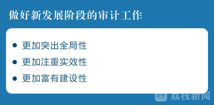 会议充分肯定了今年全省审计工作取得的成绩,强调做好新发展阶段的审计工作,要更加突出全局性,深入学习贯彻习近平总书记视察江苏重要讲话指示精神和党的十九届五中全会精神,聚焦全省工作大局和“十四五”发展目标任务,从讲政治的高度、从审计监督的角度,加强研究谋划,推进任务落实。要更加注重实效性,针对审计查出的相关问题压紧压实整改责任,在推动被审计单位即知即改、立行立改的基础上,加强跟踪问效,逐项对账销号,确保查出的问题彻底整改、全面“出清”。要更加富有建设性,坚持系统观念,在精准“治已病”的同时,立足更好“防未病”,对审计发现问题强化综合分析,对屡审屡犯、屡禁不止的问题在完善制度、健全机制方面深化研究,及时向省委、省政府提出有针对性的决策建议,加快构建集中统一、全面覆盖、权威高效的现代化审计监督体系。