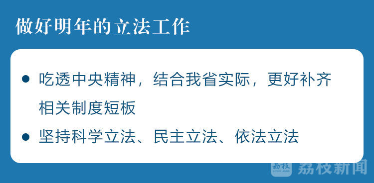 会议同意省人大常委会2021年立法工作计划安排和省政府2021年规章立法计划安排。会议强调,做好明年的立法工作,要以习近平新时代中国特色社会主义思想为指导,始终坚持党对立法工作的领导,深入学习贯彻习近平法治思想,并与学习贯彻习近平总书记视察江苏重要讲话指示精神紧密结合起来,与推动“十四五”发展开好局和现代化建设起好步紧密结合起来,吃透中央精神,结合我省实际,更好补齐相关制度短板。要坚持科学立法、民主立法、依法立法,进一步把握立法规律、突出问题导向、提升立法质量,为江苏扛起“争当表率、争做示范、走在前列”重大使命提供有力法治保障。