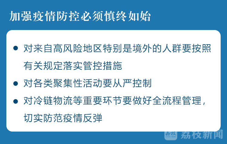 会议指出,当前国外疫情防控形势依然严峻,国内局部地区也时有散发病例,特别是元旦和春节期间人口流动加剧、聚集性活动增多,给“外防输入、内防反弹”带来很大压力,对疫情出现反复的警惕性不能降低,加强疫情防控必须慎终如始。要坚持可知可控、精准防控,毫不放松抓好常态化疫情防控,对来自高风险地区特别是境外的人群要按照有关规定落实管控措施,对各类聚集性活动要从严控制,对冷链物流等重要环节要做好全流程管理,切实防范疫情反弹。