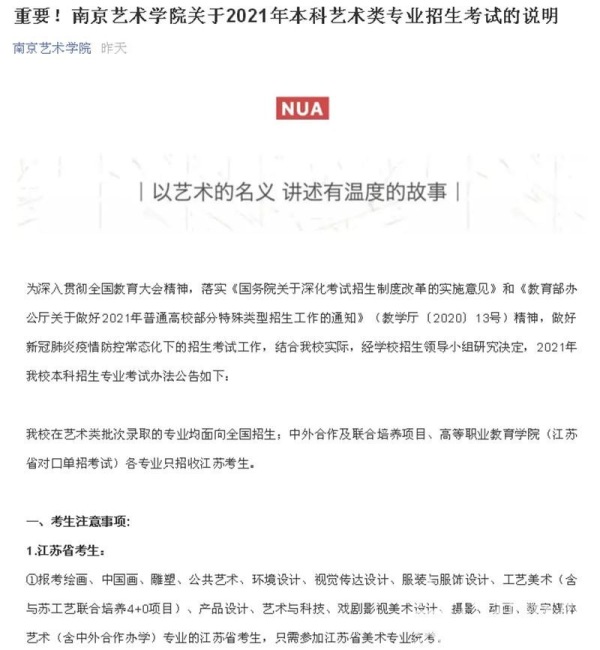 1 月 11 日,南京艺术学院发布《2021 年本科艺术类专业招生考试说明》(以下简称 "《说明》")。今年,南艺在艺术类批次录取的专业,均面向全国招生,文理兼收,中外合作及联合培养项目、高等职业教育学院(江苏省对口单招考试)各专业只招收江苏考生。此外,《说明》还明确了报考该校部分艺术类专业,必须参加由该校自主组织的专业考试,即 " 校考 "。艺考生可在 1 月 15 日 18 点前,通过 " 南京艺术学院招生考试 " 微信公众号进行报名、缴费。部分校考设初试、复试,初试均为在线考试,只有一轮考试的专业,则采取现场考试。考生需在 2 月 6-7 日确认到现场考试时间,2 月 17 日起,按时到南艺参加现场考试,请考生在报考时千万注意。