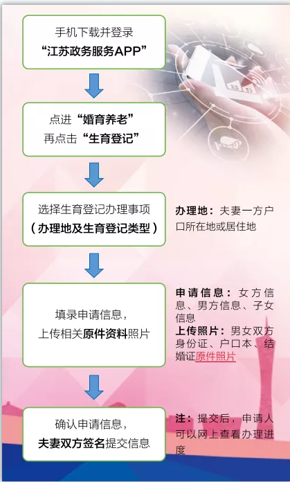 据悉,申请人网上办理操作流程如下:先在手机下载并登录“江苏政务服务”APP;点进“婚育养老”,再点击“生育登记”;选择生育登记办理事项(办理地及生育登记类型);填录申请信息,上传相关原件资料照片;确认申请信息,夫妻双方签名提交信息。