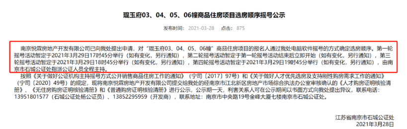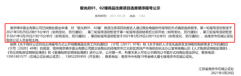 据南京市石城公证处官网发布的消息,江北核心区楼盘长江时代1516的报名清册已经公示,该楼盘分为宸光府和琨玉府两部分,房源总数为552套,共吸引12796组买房人报名,整体中签率仅为4%。其中宸光府的房源为176套,吸引6458组买房人,人才中签率为12.9%,无房家庭中签率为2.5%,普通买家中签率只有1.1%;琨玉府的房源数为376套,吸引6338组买房人,人才中签率为28%,无房家庭中签率为5.5%,普通买家中签率只有2.5%。据悉,摇号时间为3月29日下午5点45分至22点15分,摇号将分4轮进行。