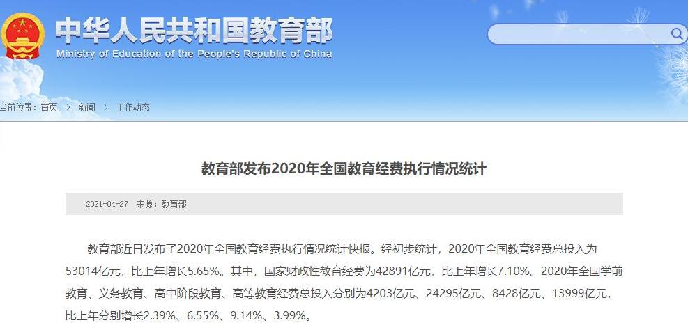 据教育部网站消息,教育部近日发布了2020年全国教育经费执行情况统计快报。经初步统计,2020年全国教育经费总投入为53014亿元,比上年增长5.65%。其中,国家财政性教育经费为42891亿元,比上年增长7.10%。2020年全国学前教育、义务教育、高中阶段教育、高等教育经费总投入分别为4203亿元、24295亿元、8428亿元、13999亿元,比上年分别增长2.39%、6.55%、9.14%、3.99%。