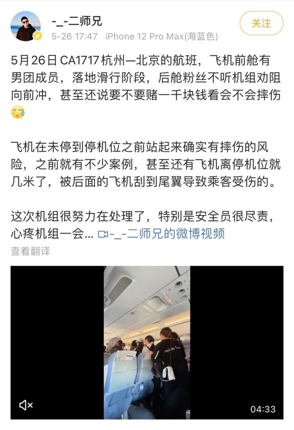 此前,有网友发微博称,5月26日,中国国航CA1717杭州-北京航班落地滑行阶段,因前舱有男团成员,后舱粉丝不听机组人员劝阻向前冲。