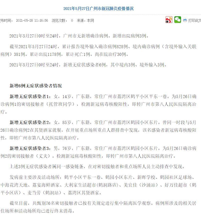荔枝新闻讯 广州市卫健委网站消息,2021年5月27日0时至24时,广州市无新增确诊病例。新增出院病例3例。