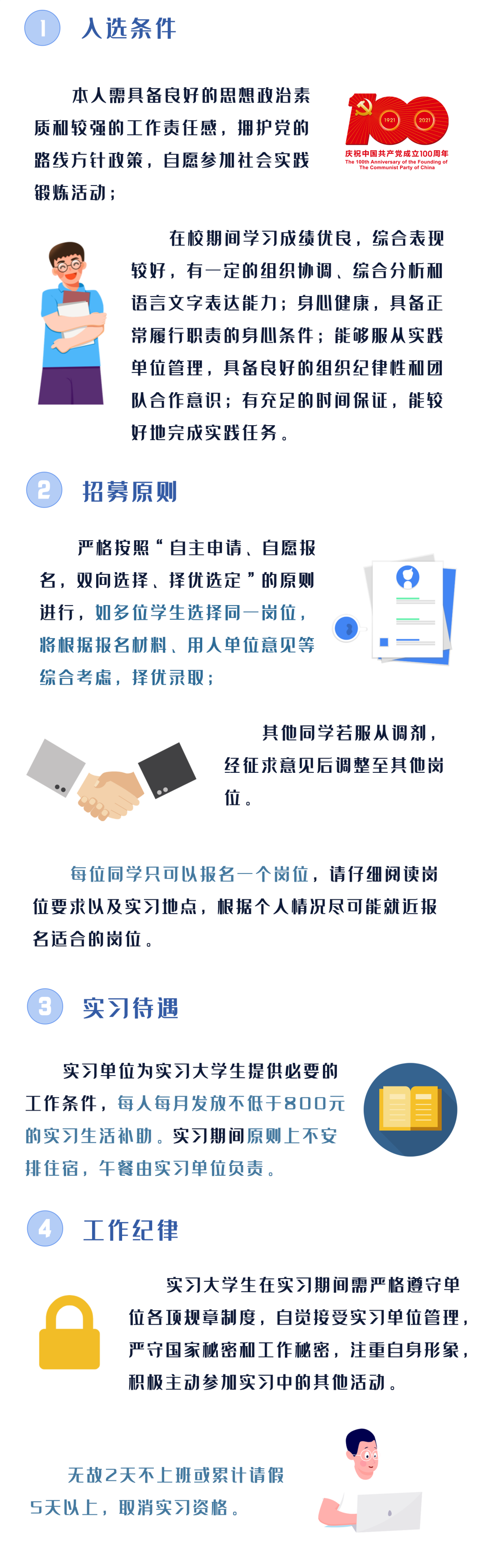 即日起至2021年6月29日,有意参加淮安市暑期实习的在校大学生可结合岗位要求选择实习岗位,报名工作不收取任何费用,请广大学生提高警惕,防止上当受骗。每名学生只可以报选1个实习岗位。