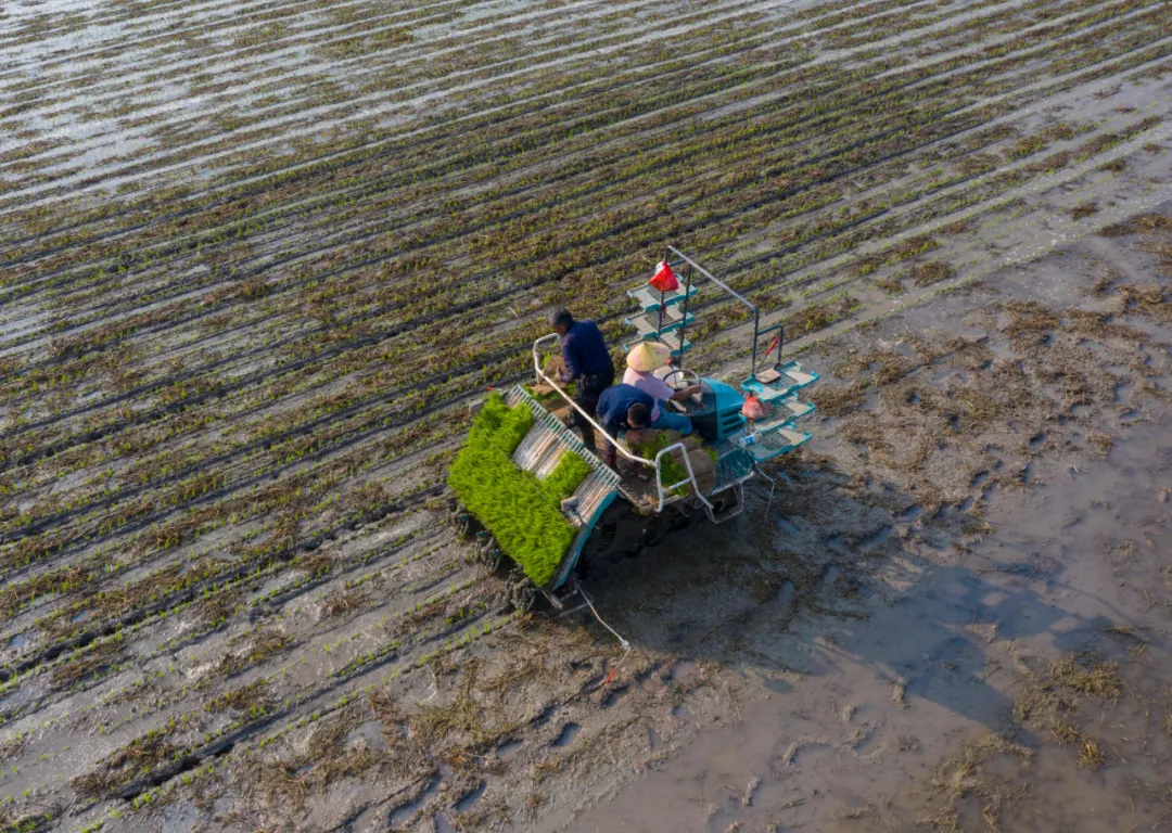 一台插秧机正在稻田里吟唱,一行行新插的秧苗,如绿色的海浪在微风中摇曳。