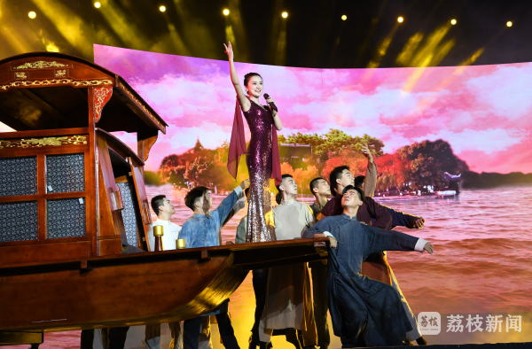 一艘红色的木船从舞台一侧缓缓行来,船上传来了悠扬的歌声,歌舞《南湖的船,党的摇篮》讲述着百年前南湖红船上的故事,一段撼天动地的革命征程由此启航。音舞诗画《三条桥火种》《心中的火炬》把观众拉回了那个硝烟弥漫的年代,让人感受到了一代江海儿女的热血与牺牲。随着情景舞蹈《车轮滚过大平原》、群舞《解放区的天》,胜利的曙光终于呈现,欢快的舞步、飘飞的红绸洋溢着一片欢欣鼓舞的氛围。放眼华夏大地,到处是改革发展的宏伟画卷,到处是小康梦圆后的幸福景象。舞乐《这里的美景赛江南》、海门山歌表演唱《声声山歌颂家乡》、女声表演唱《雕花的哥哥回来了》,勾勒出一幅美好的江海风韵图。而歌曲联唱《中国长江口》《幸福海门》《龙腾江海》则大气磅礴,令人振奋。一群少年带来的武术表演《启航》让人眼前一亮,几位青年表演的音乐快板《初心如磐向未来》意蕴深长,从少年到青年,一路续写着奋斗的华章。男声小合唱《时代号子》、音舞诗《领跑新征程》刻画了百万海门人民勇当新征程领跑者的信心和勇气。