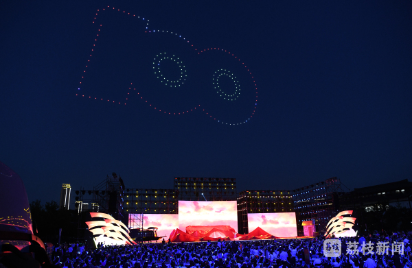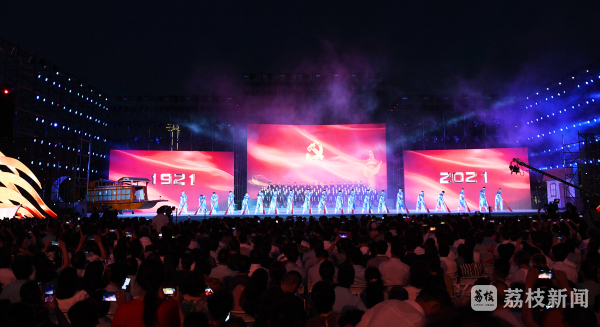 红绸铺就的舞台,在晚风中摇曳成一片红色的海洋。舞台两侧,分别竖立着“1921”和“2021”两个数字,无人机组缓缓上升,组成了光辉的“100”字样,标志着中国共产党走过的波澜壮阔的100年。“唱支山歌给党听……”一道清亮的童声响起,划破夜色,沁人心肺。雄浑有力的大合唱《没有共产党就没有新中国》正式拉开了整场晚会的序幕。