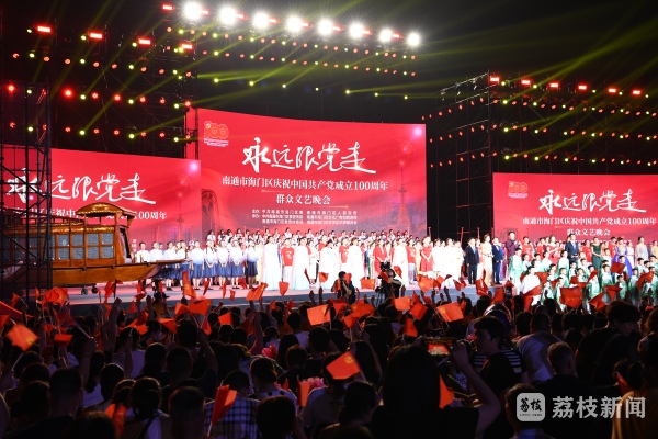 6月28日晚的江海文化公园,掀起了一股股红色的浪潮。由区委、区政府主办,区委宣传部、区文广旅局、教体局、文联承办的“永远跟党走”南通市海门区庆祝中国共产党成立100周年群众文艺晚会正在这里举行。区委书记郭晓敏,区委副书记、区长沈旭东,区人大常委会主任成伟,区政协主席倪永平,区委副书记徐加明等四套班子领导与市民群众一起观看演出。