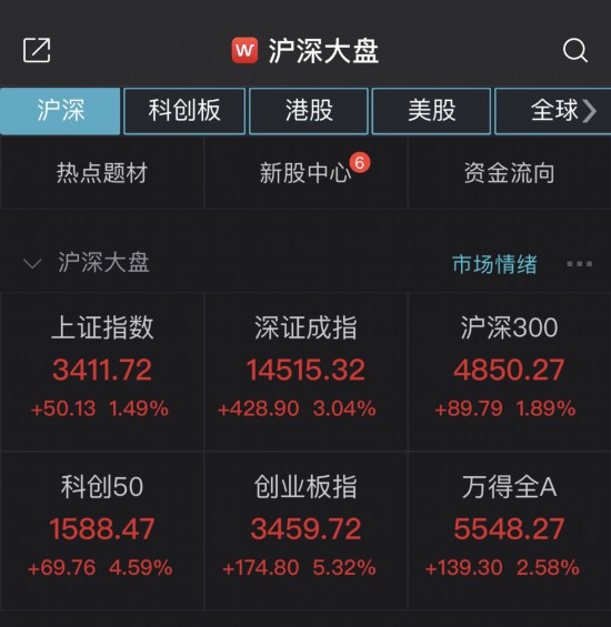 截至收盘,沪指涨1.49%,报3411.72点。深证成指涨3.04%,报14515.32点。创业板指涨5.32%,报3459.72点。两市3662只个股飘红。