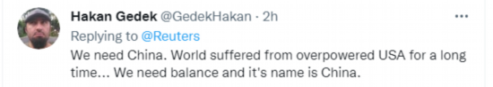也有英国网友站出来说,“我们需要中国。世界长期遭受美国的压制。我们需要平衡,它的名字叫中国。”