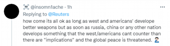 推特上,有网友称,“为什么西方和美国发展出更好的武器就没问题,但一旦俄罗斯、中国或任何其他国家发展出西方或美国无法抗衡的东西,就会有‘影响’,全球和平就会受到威胁?”