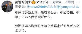 还有网友评论称,“中国的价值观不主张对立,而是接纳融合。不如说主张对立的是欧美吧?就像在幕末(明治维新)时期(挑拨幕府与藩之间对立)那样。”