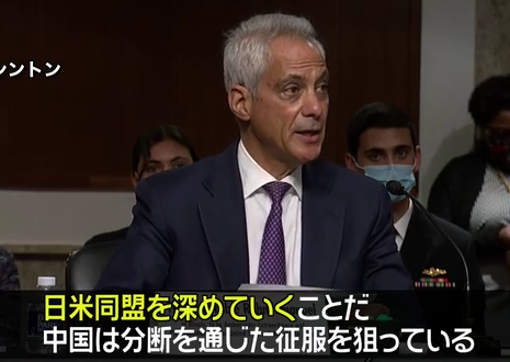 据日本电视台21日报道,伊曼纽尔美国时间20日在美国国会的听证会上对中国大放厥词,“我的首要任务是,深化日美同盟关系,面对共同的问题。中国企图利用对立实现征服。”随后,他还宣称,“美国的战略是基于团结建立安保,地区的团结建立在日美同盟的基础之上。”