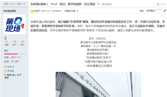 例如,无锡市义务教育学校全面实施 “5+2”课后延时服务模式首日,“东林第e 现场”走进无锡市崇宁路实验小学,用图文记录下学校开展的课后服务,打消了部分家长心中的顾虑。