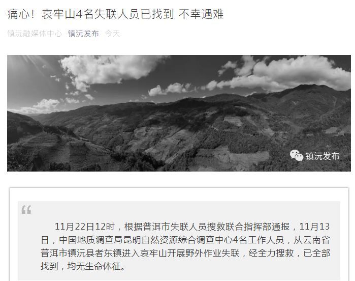 荔枝新闻讯 据“镇沅发布”消息,11月22日12时,根据普洱市失联人员搜救联合指挥部通报,11月13日,中国地质调查局昆明自然资源综合调查中心4名工作人员,从云南省普洱市镇沅县者东镇进入哀牢山开展野外作业失联,经全力搜救,已全部找到,均无生命体征。