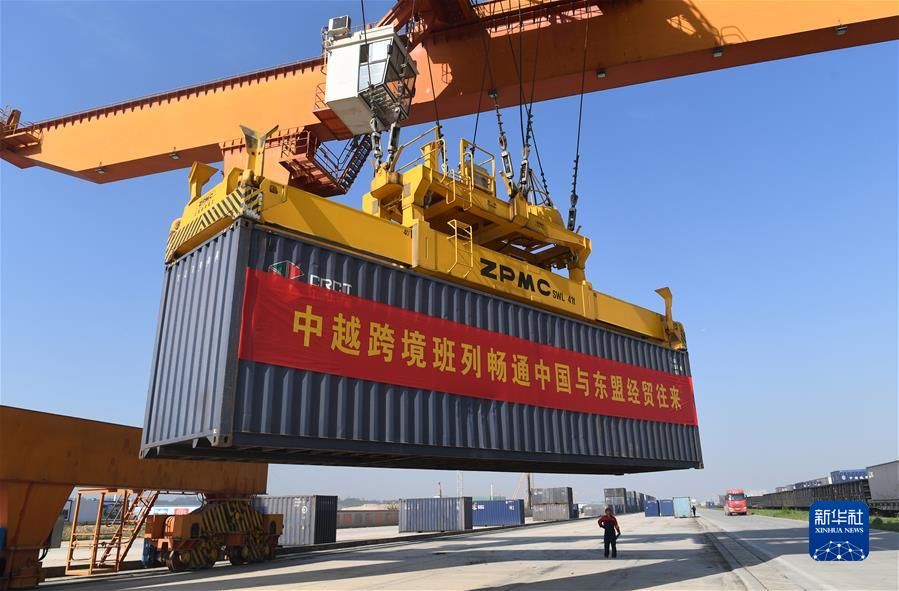 在广西南宁国际铁路港,工人在吊装中越跨境班列货物集装箱(2020年11月11日摄)。新华社记者 陆波岸 摄