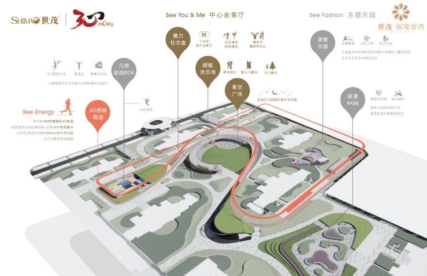 社区内部主打自然、健康、童趣、艺术人居体验,打造了会客厅、阳光草坪、4D跑道、波普乐园、休闲养生区等区域,满足不同年龄段居住者的运动休憩需求。