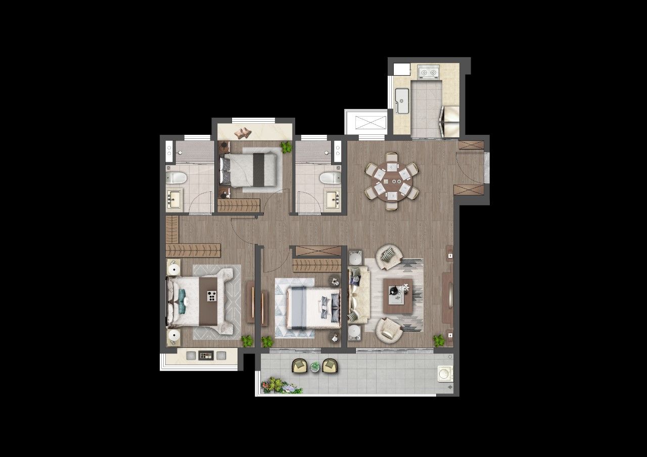 户型解析:建筑面积约119㎡的户型,为三房两厅两卫设计,相较于建面约95㎡的户型,空间尺度上更加的阔绰,主卧配齐卫生间和衣帽空间,兼具尺度感和私密性。