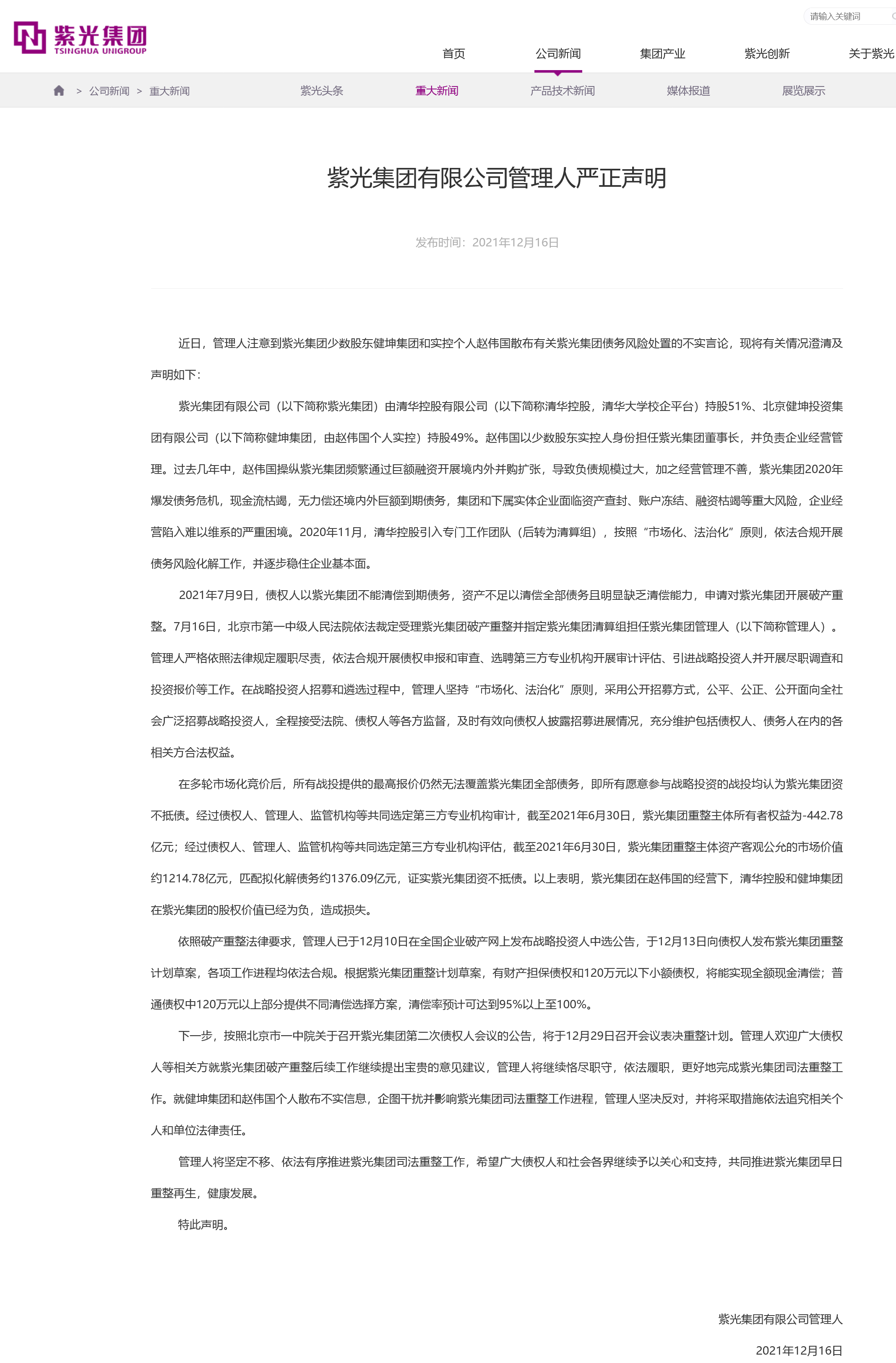 荔枝新闻讯 12月16日,紫光集团官网发布《紫光集团有限公司管理人严正声明》。