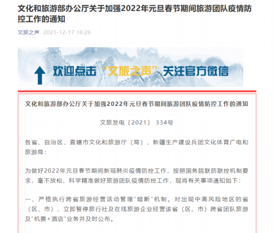 荔枝新闻讯 12月17日,文化和旅游部办公厅发布了关于加强2022年元旦、春节期间旅游团队疫情防控工作的通知,具体内容如下: