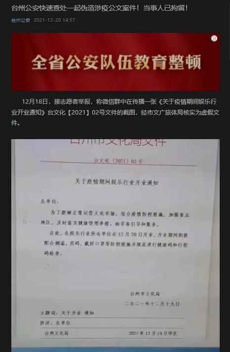 荔枝新闻讯 据“台州公安”微信号消息,12月18日,接志愿者举报,称微信群中在传播一张《关于疫情期间娱乐行业开业通知》台文化【2021】02号文件的截图,经市文广旅体局核实为虚假文件。