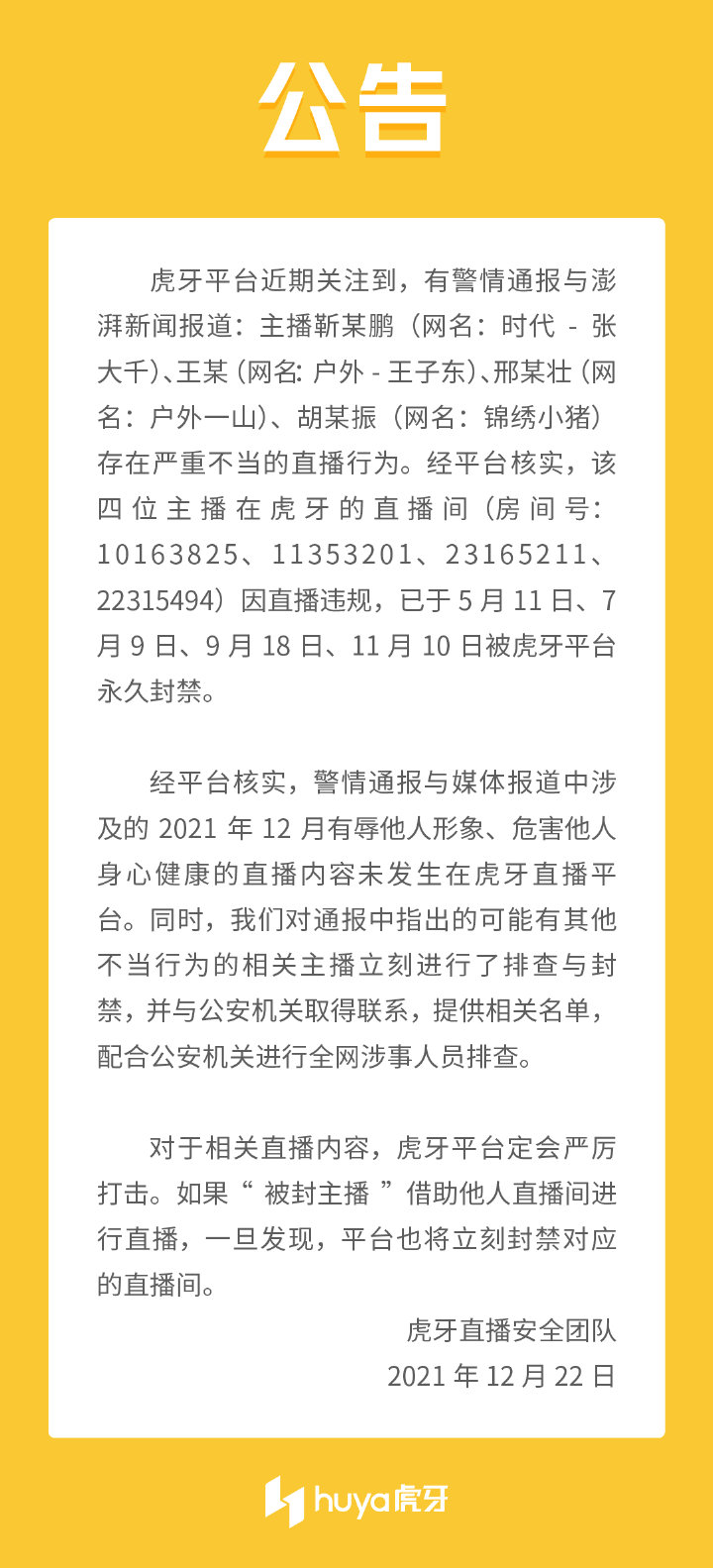 荔枝新闻讯 @虎牙直播官方微博消息,虎牙平台近期关注到,有警情通报与澎湃新闻报道:主播靳某鹏(网名:时代-张大千)、王某(网名:户外-王子东)邢某壮(网名:户外一山)、胡某振(网名:锦绣小猪)存在严重不当的直播行为。经平台核实,该四位主播在虎牙的直播间(房间号:10163825 1135320123165211、22315494)因直播违规,已于5月11日、7月9日、9月18日、11月10日被虎牙平台永久封禁。