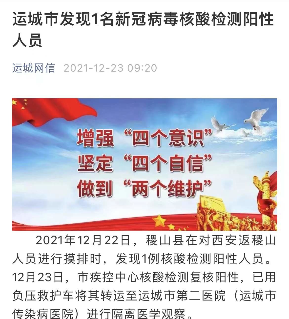 荔枝新闻讯 据运城网信微信公众号消息,2021年12月22日,山西运城市稷山县在对西安返稷山人员进行摸排时,发现1例核酸检测阳性人员。12月23日,市疾控中心核酸检测复核阳性,已用负压救护车将其转运至运城市第二医院(运城市传染病医院)进行隔离医学观察。