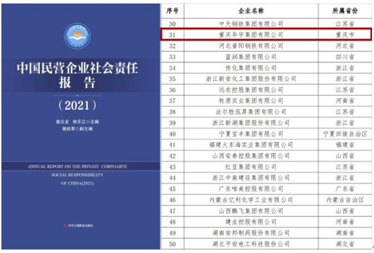 2021年12月21日,全国工商联召开十二届五次执委会。会上,全国工商联副主席邱小平代表全国工商联发布《中国民营企业社会责任报告(2021)》。报告首次公布了 “2021中国民营企业社会责任100强榜单”,华宇集团荣登榜单并位列第31位。