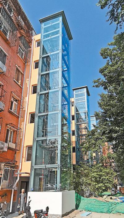 北京市海淀区北太平庄街道一居民楼完成旧楼改造加装电梯惠民工程主体施工。林 晖摄(影像中国)