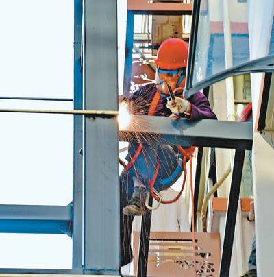 江西省赣州市赣县区城南社区井前家园,工人在焊接旧居民楼加装电梯钢结构外立架。朱海鹏摄(影像中国)