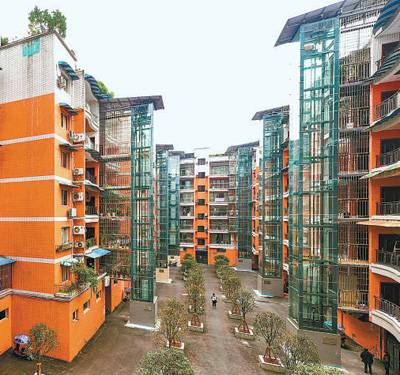 重庆市垫江县桂溪街道松林社区桂冠花园小区,老楼加装电梯后居民出入更方便。齐岚森摄(人民视觉)