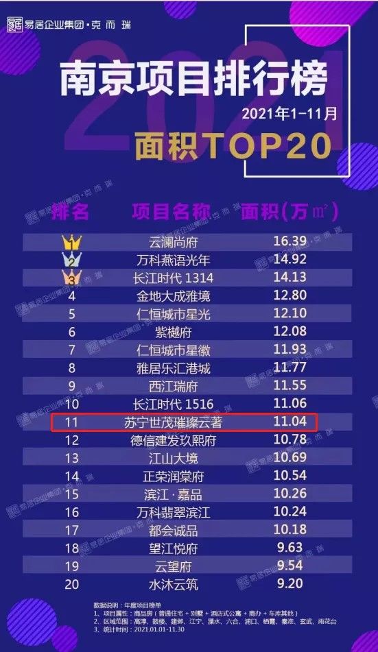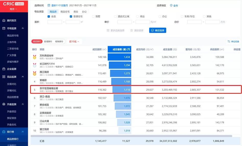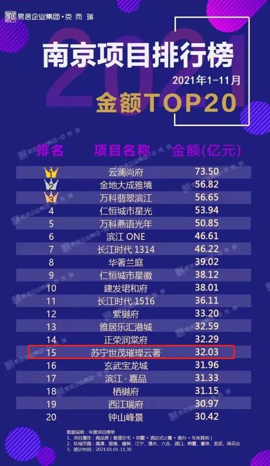 截止11月30日,项目成交套数荣登南京项目TOP5!销售面积荣登南京项目排行TOP11,销售金额荣登南京项目排行TOP15!(以上数据来源南京克而瑞,同步南京房管局网上备案成交数据)
