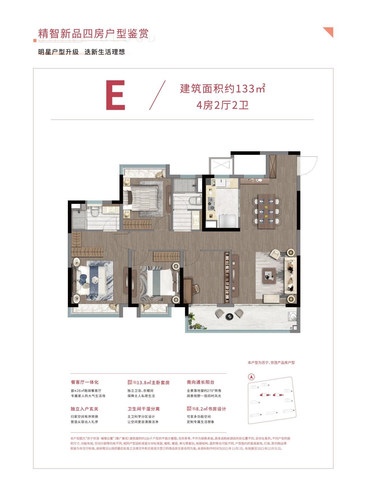 本宣传资料仅为要约邀请,相关宣传内容不排除因政府相关规划、规定及出卖人分期规划等原因而发生变化,所载全部内容仅供参考,均不构成要约,一切以双方签订的商品房买卖合同及其附件约定及政府最终审批文件规定为准。项目推广案名为苏宁世茂璀璨云著,政府备案核准名为璀璨云著花园。房地产开发企业为南京万智源置业有限公司。预售证号:2021100230。本公司保留对此宣传资料修改的权利,敬请留意最新资料。资料制作时间为2021年12月24日,有效期截止至2021年12月31日。