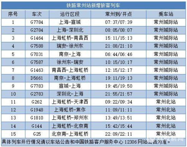 此次调图,铁路常州站共增加京津、江西、广东、河南、苏北等多个重点方向的旅客列车15列,其中常州城际站新增旅客列车10列,常州北站新增旅客列车5列,调图后铁路常州站共开行旅客列车515列。