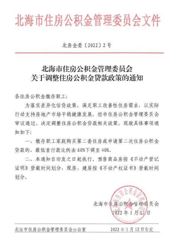 中新经纬电 据广西北海市政府网站消息,北海市住房公积金管理委员会近日印发《关于调整住房公积金贷款政策的通知》(下称《通知》)。《通知》自2022年1月12日起执行。