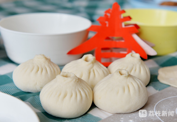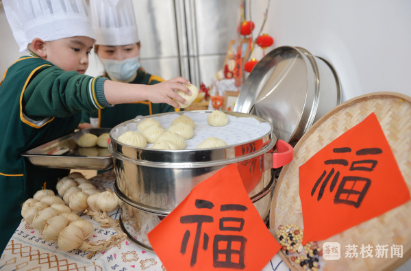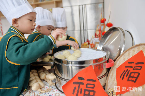 记者在现场看到,教室里贴着福字的笼屉上场后,孩子们期待的“蒸包子”活动开始了。大家洗手、戴上手套就迫不及待地开始制作自己的“包子”。