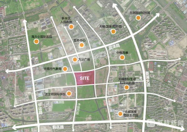 无锡交响音乐厅选址高新区太湖湾科创城中轴线中央地块,地块东至广场东路,南至科创路,西至净慧西道,北至清源路。音乐厅毗邻翡翠河,周边配套成熟,融秀美的临水景观环境和活力繁华的都市功能于一身,集功能性与艺术性为一体。项目总用地面积约100亩,规划建筑面积共10万平方米,主要包含“一厅两中心”:一厅为无锡交响音乐厅,总建筑面积约5万平方米;两中心分别为艺术交流中心和演艺商业中心,总建筑面积共约5万平方米。在功能上,交响音乐厅的主体功能包括1500座音乐厅、500座室内乐演奏厅以及符合厅团合一使用需求的相关配套附属功能;艺术交流与演艺商业中心功能包括音乐演艺、培训创作、展示交流、文娱休闲、商业美食等业态,形成功能复合、多元活力的高品质国际街区。