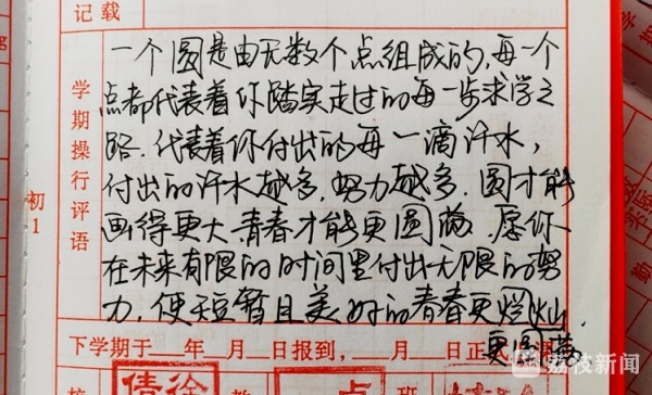 “有时候提到数学,他们会觉得枯燥乏味。我觉得数学其实是很浪漫的一门学科,它甚至可以去传递爱意。我是想鼓励他们一下,因为学生其实是蛮在乎老师的评价的。作为班主任,每学期的评语这个事情需要我们用心去做好,也是与学生建立深刻情感的一个机会。”苏州立达中学初三(11)班班主任徐婧说。