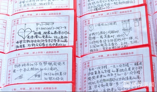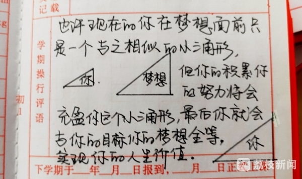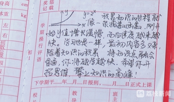 “y=2的X次方,积累知识的过程就像一条指数函数,刚开始y值增长缓慢,而后速度越来越快,学习也是一样的。你的发展是可以像指数函数一样厚积薄发的。”“一个圆是有无数个点组成的,每一个点都代表着你踏实走过的每一步求学之路,代表着你付出的每一滴汗水。”“高斯说,二分之一个证明等于零。意思是,证明不能进行到一半就不证明了,做事情也一样。”47份评语,分为公式、定理、定义、图形等多个类别,公式与几何图形是徐老师一笔一划亲画,表达数学美感的同时也传递着哲理和老师的希望。这样的评语一下子“俘获”了学生们的心。