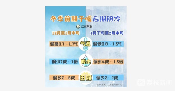 根据江苏省气候中心发布的报告,2021年12月至2022年2月,江苏省平均气温4.3℃,较常年同期偏高0.4摄氏度;全省平均降水量较常年同期偏少3.4成,整个冬季偏向于暖冬。从2021年全年来看,江苏的年平均气温是16.8摄氏度,较常年偏高1.1摄氏度,是1961年以来的历史最高。