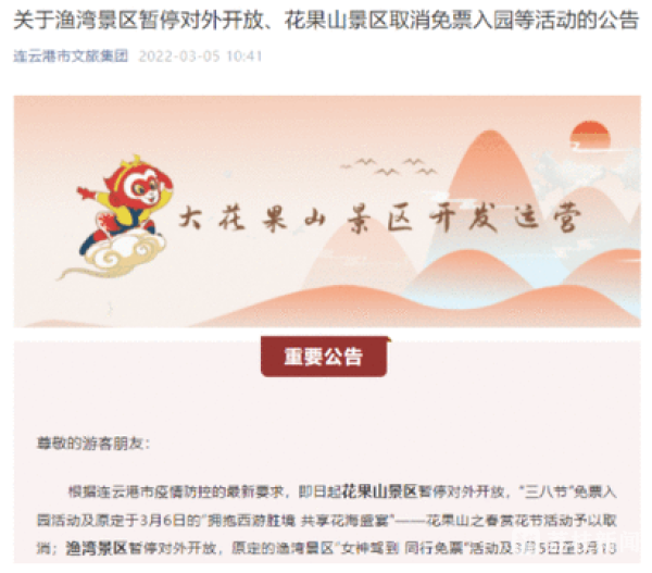 疫情发生以来,连云港市文旅集团按照2022年1月制订的《文旅集团2022年疫情防控工作方案》,明确工作职责,在集团新冠疫情防控工作领导小组的领导下,坚持“预防为主,防治结合”的工作方针,第一时间部署各项防疫工作。及时发布渔湾景区暂停对外开放公告,暂停花果山景区内的360极限飞球项目、滑索项目和西游文创旗舰店的运营,对渔湾游客中心项目部、南天门景点及服务点改造项目部、樱桃谷新型农村社区项目部实行封闭式管理,严格落实疫情防控各项工作要求,筑牢疫情防控“安全墙”。