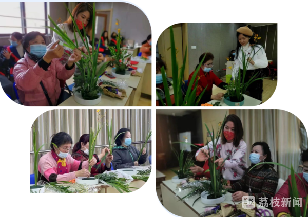 在老师的点评和志愿者们的帮助下,大家的作品经过巧妙搭配布局、精心创意点缀、疏密相间造型,充满诗情画意、赏心悦目。“生机盎然”里美丽摇曳,“万紫千红”中赏尽“春夏秋冬”四季美色,嗅花香,品韵味,赏千姿,幸福如花。