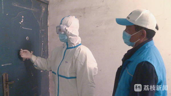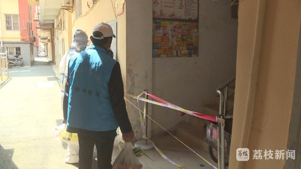 “你好,我是社区工作人员,给你送点菜,还带了点口罩和消毒液,平常自己在家里面可以消消毒,放在门口了,你等下出来拿一下。”宋书英说。