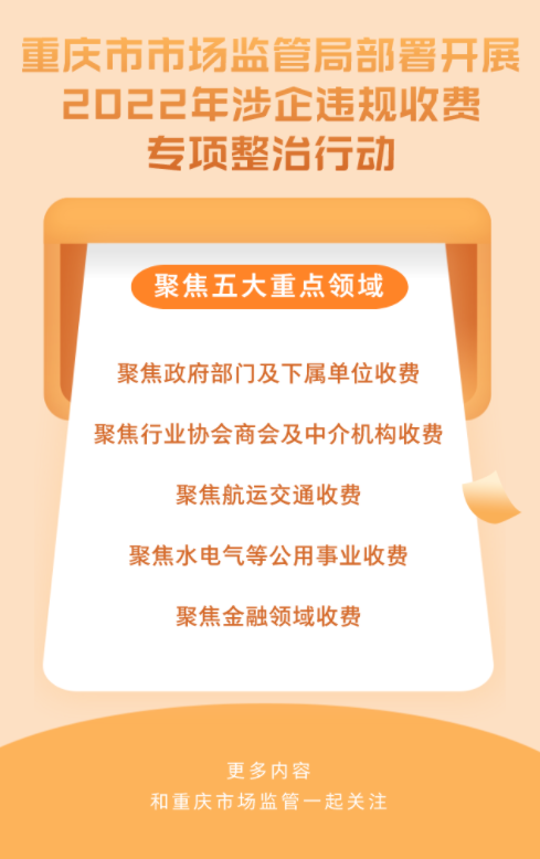 荔枝新闻讯 据重庆市场监管微信公众号消息,近日,重庆市市场监督管理局在全市范围内部署开展2022年涉企违规收费专项整治行动。重点聚焦政府部门及下属单位收费、行业协会商会及中介机构收费、航运交通收费、水电气等公用事业收费、金融领域收费五大重点领域。此次专项整治行动将持续开展到12月。