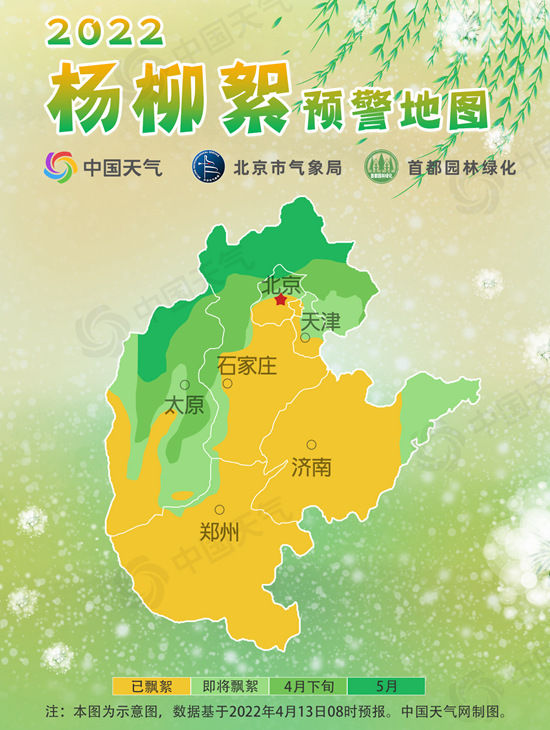 截至4月13日,华北中部和南部、黄淮大部等地的杨柳絮已经飘飞。像天津南部、河北中部和南部、山东西部和中部、山西西南部等地都能看到“飞絮如雪”;在山东半岛地区、天津北部、河北东北部部分地区以及西南太行山脉沿线一带、山西东南部和西北部以及中部河谷地带杨柳絮即将进入飘飞时段;山西中北部和东北部、河北中西部和东北部部分地区的杨柳絮飘飞时间略晚,将在4月下旬开始;山西北部、河北北部杨柳絮飘飞时间最晚,将在5月开始。