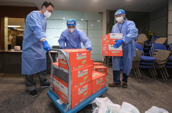 ↑中国银行上海市分行后勤服务中心副总经理王梁辉(左)、主管韩皓(中)和员工薛锋为闭环管理办公地准备物资。