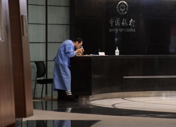 ↑中国银行上海市分行后勤服务中心主管韩皓在大楼内一处空旷的位置独自吃午饭。