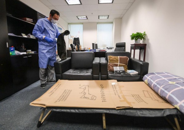 ↑在中国银行上海市分行后勤服务中心办公室内,53岁的王梁辉在自己的折叠床上铺垫硬纸板缓解长时间使用带来的不适,同时解决了床铺稍短的问题。